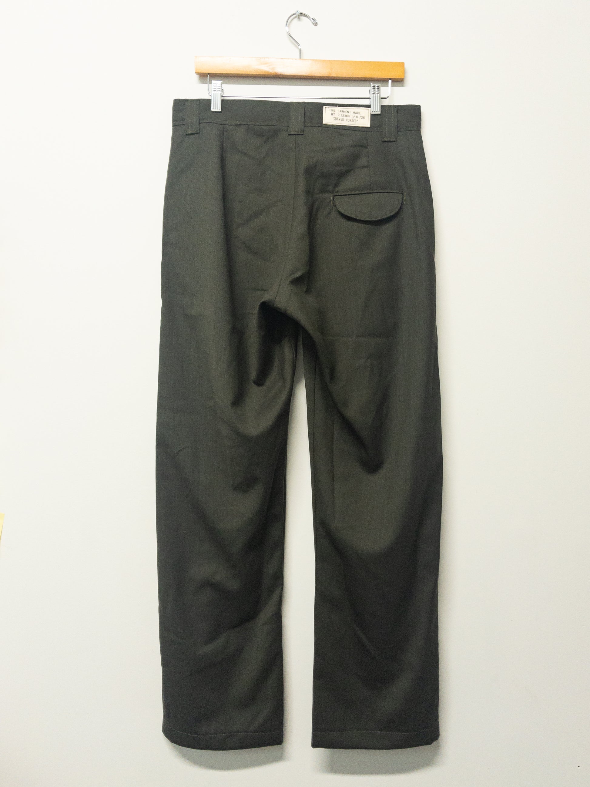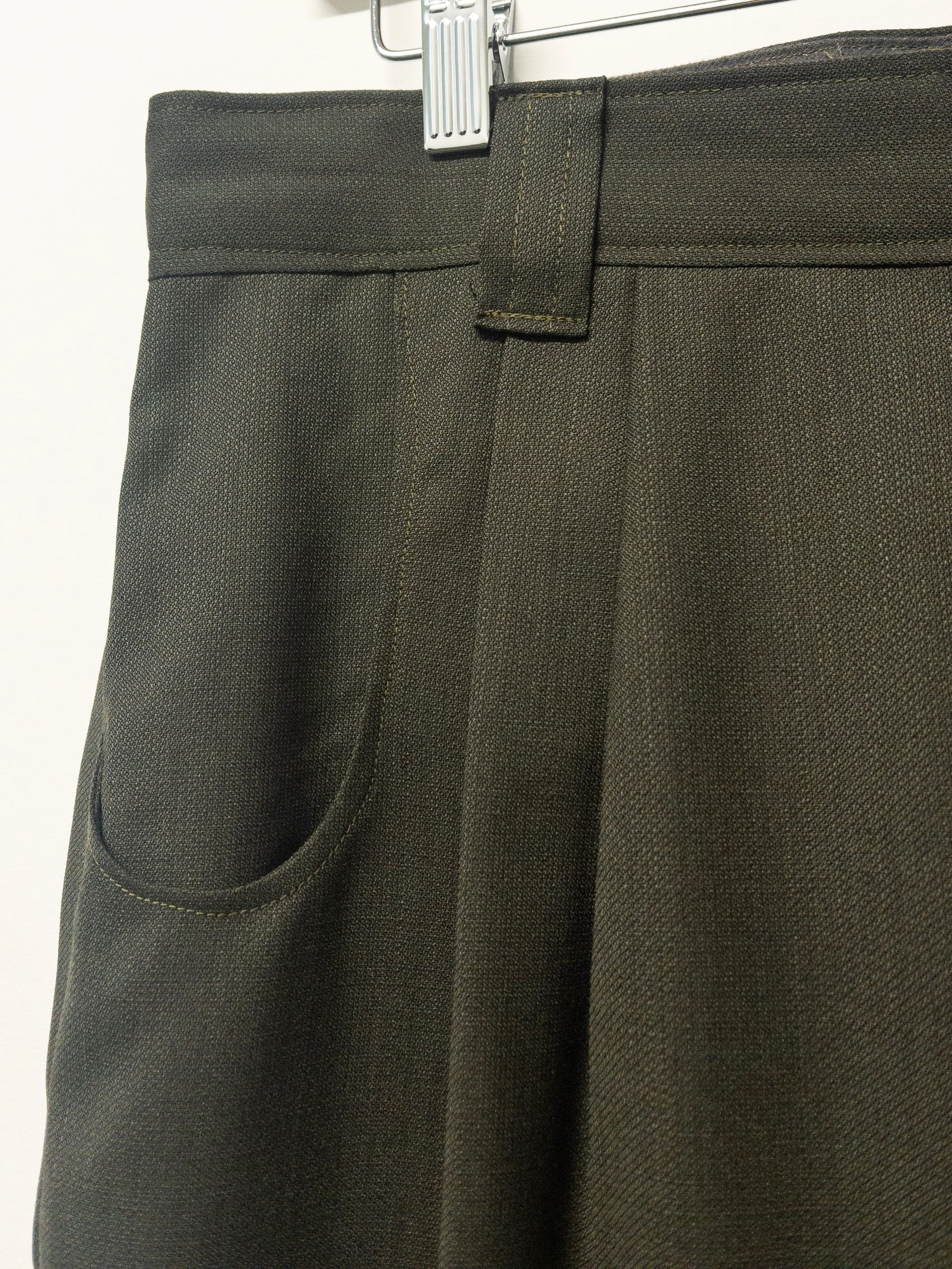 double pleat trousers made from an olive green 100% worsted wool diamond weave suiting. if i were wishcasting my own personal revolutionary guard into existence, kind of like a free officer's movement kind of situation in which a vanguard style coalition consolidates armed divisions in opposition to the state apparatus (i promise i'm not doing this), this would be the fabric for uniform trousers. very supple drape, with an almost 'technical / performance fabric' feel to it (maybe due to the dry hand? the intricacy of the weave?) despite being pure wool. suiting weight, so on the lighter side, but by no means insubstantial - perfect 3 season pant, 4 if your winters are milder.