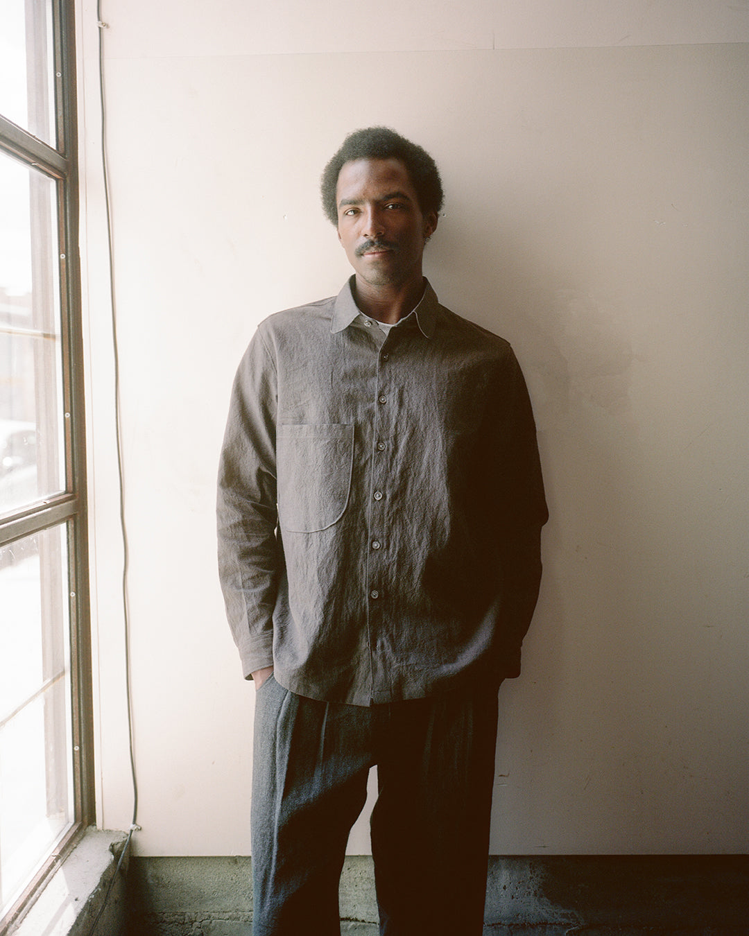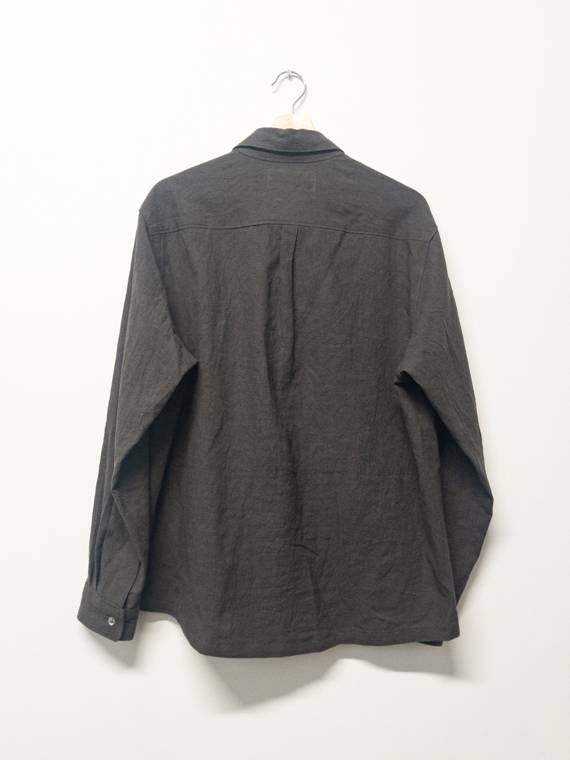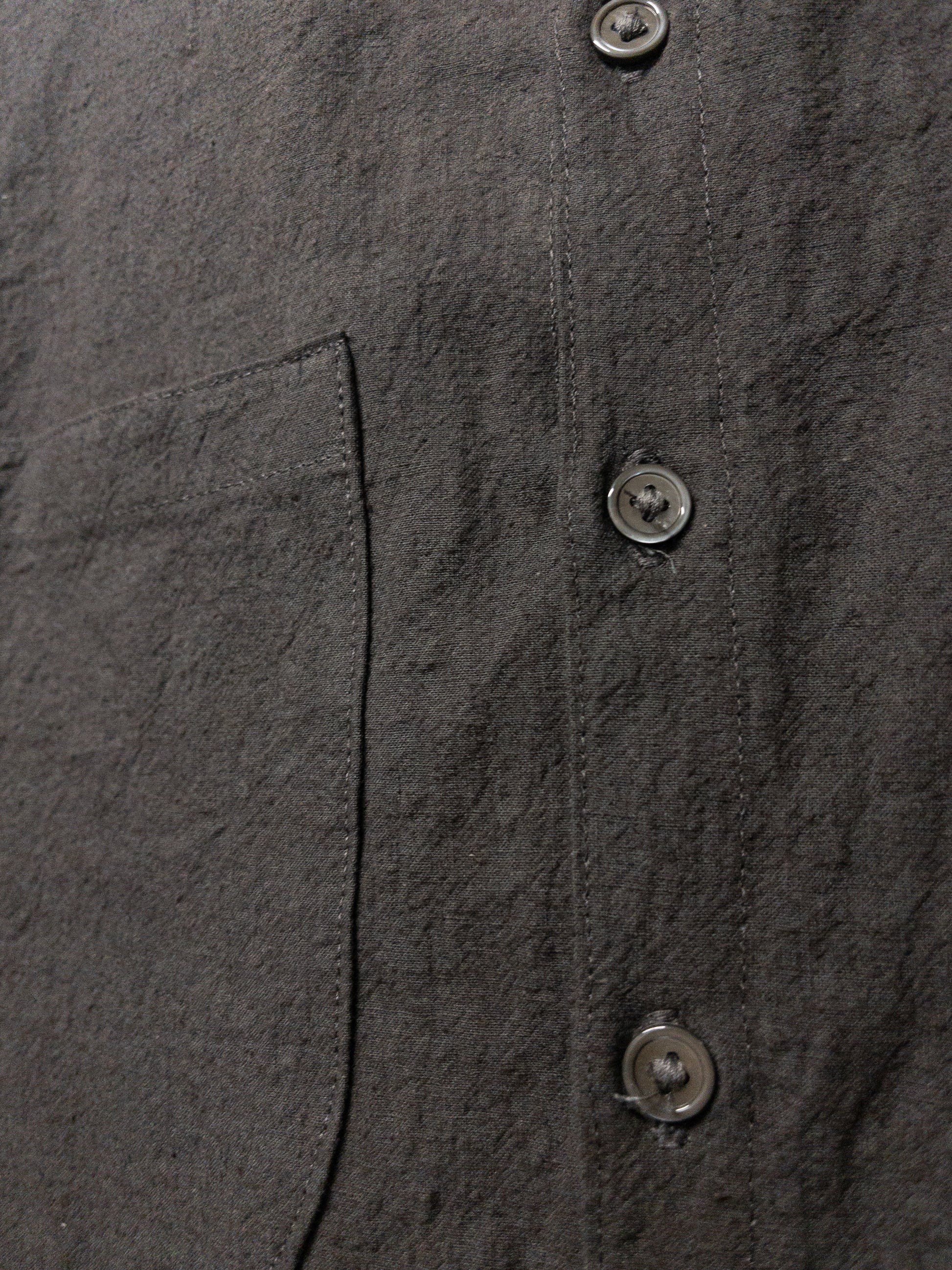 60% cotton / 40% linen washed poplin fabric from japan. the dyers leave the fabric to dry out in the sun, which gives it a slightly rippled, watercolor-y finish and a lot of texture. it has a bit of structure from the high-density poplin weave, as well as a crisp, dry hand, but it's offset nicely by the linen content, which gives it some fluidity and drape. deep inky slate color, very moody shade.