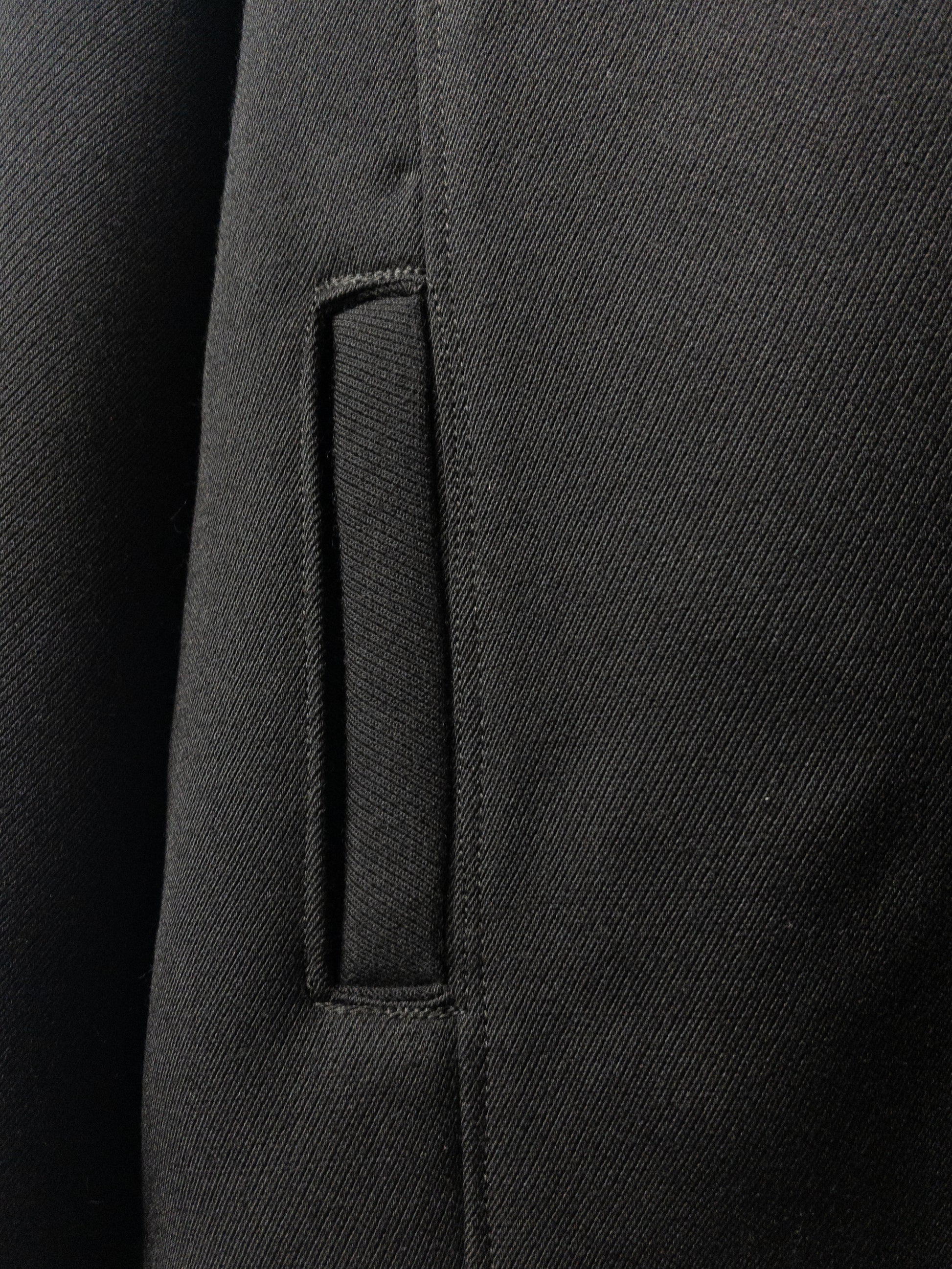 black 15oz. 100% wool cavalry twill from italy. cavalry twill is a heavy duty double twill weave originally used for riding trousers in 19th century military uniforms. it's crazy dense and durable - the face side (the side that touches the world, not your body) almost feels like a scuba suit to me, quite impervious to elements.